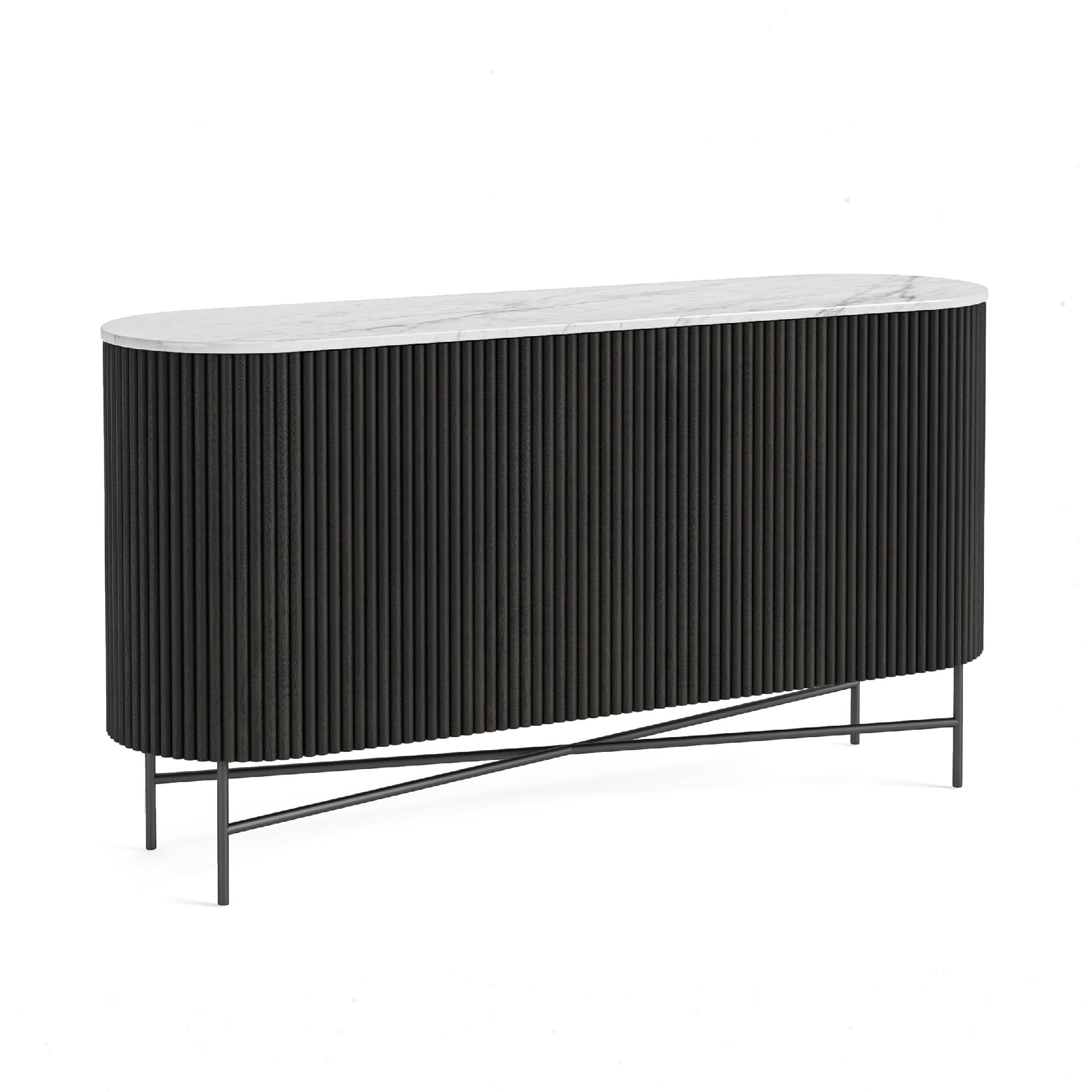 Solid mango flutes are carefully hand-sanded and hand-stained to achieve a smooth, streamlined finish. Precision fluting follows the elegant curves of the piece, crafted using state-of-the-art machinery. The rounded, powder-coated legs complement the overall silhouette while adjustable feet ensure stability on uneven floors.